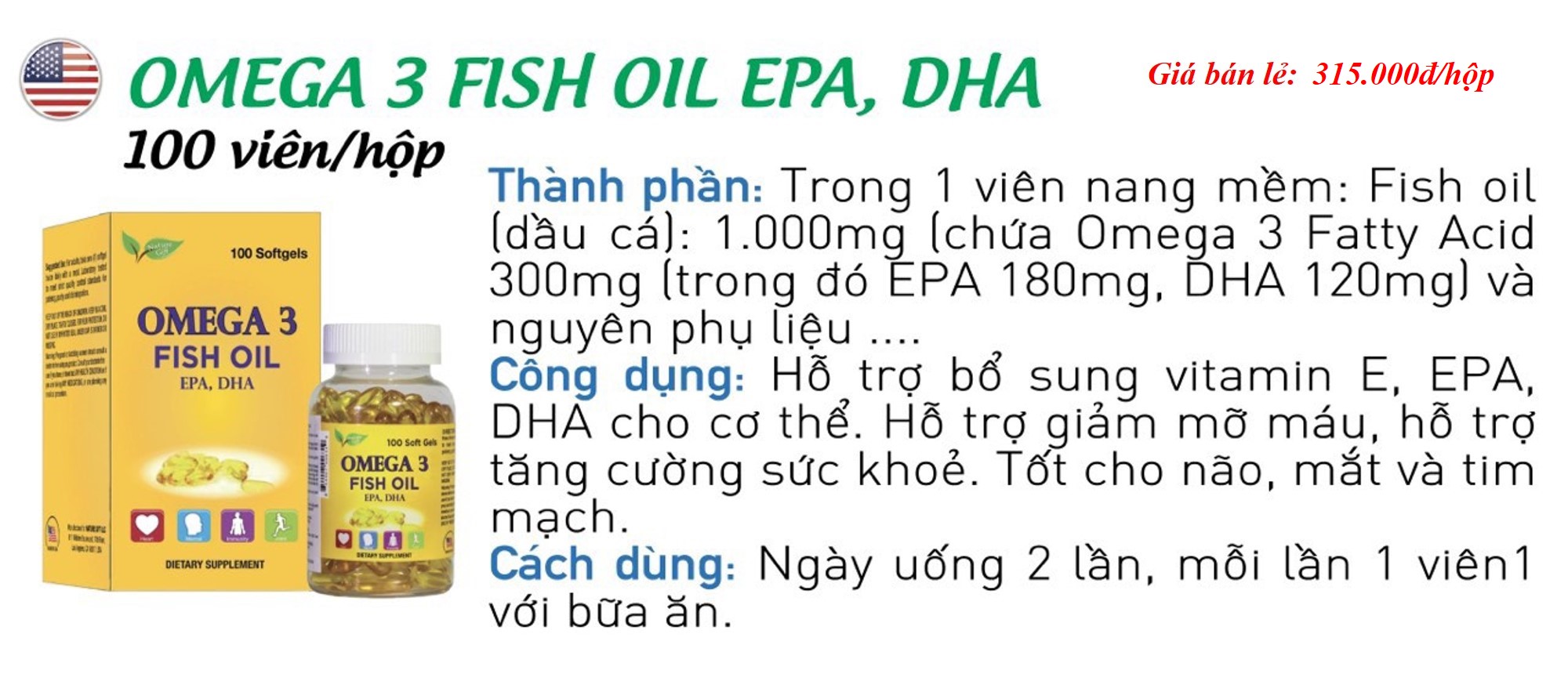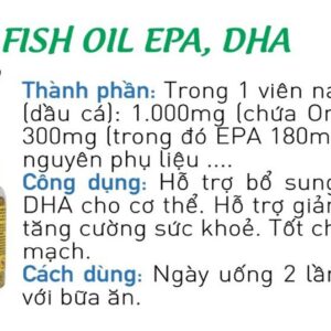 – Dầu cá: 1000mg (gồm Omega 3 Fatty Acid 300mg, trong đó có EPA 180mg, DHA 120mg) và nguyên phụ liệu….